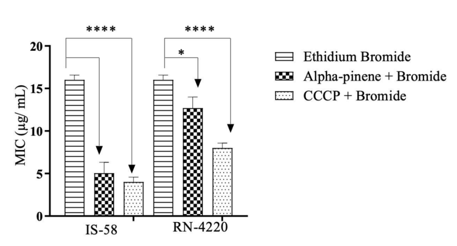 - α-피넨을 항생제와 병용 시, 내성균주에 대한 MIC 감소 효과