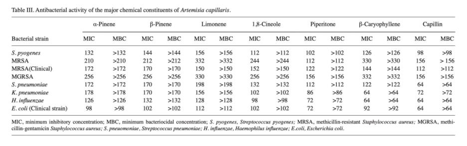 - α-피넨은 다양한 세균에 대해 보통에서 강력한 항균 효과를 나타냄