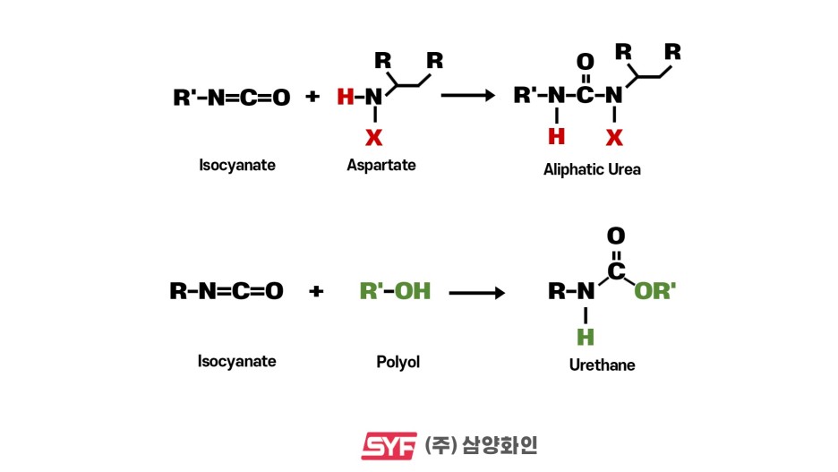 실제로, 이 기술은 지방족 폴리우레아aliphatic polyurea기술을 기반으로 하고 있으며, 우레탄 화학군urethane chemical group과 폴리아스파틱-에스테르polyaspartic-ester의 반응에 의해 형성되는 새로운